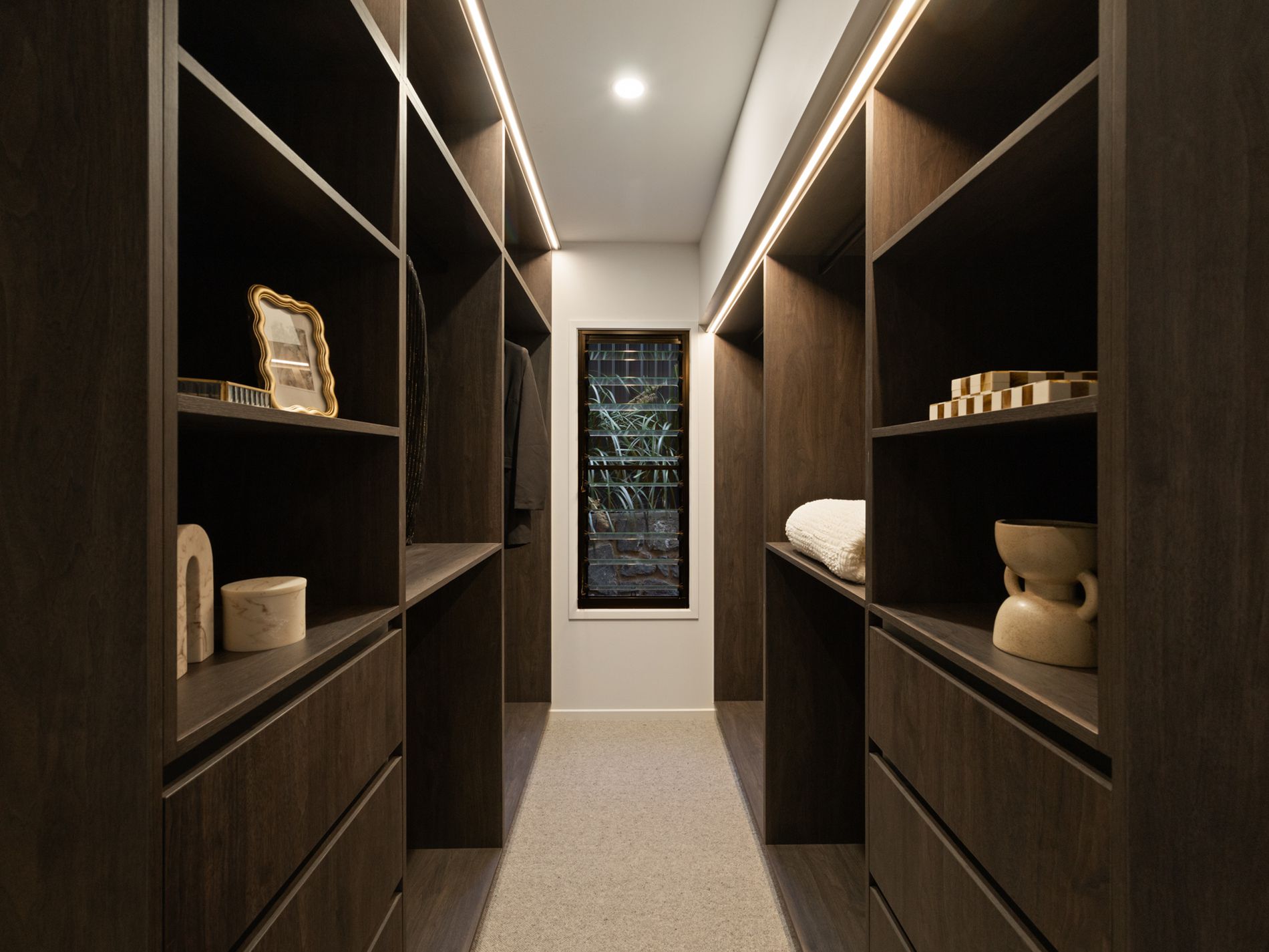 *Gourmet kitchen with Calacatta stone benchtops, integrated appliances, custom woodgrain cabinetry, and a butler’s pantry